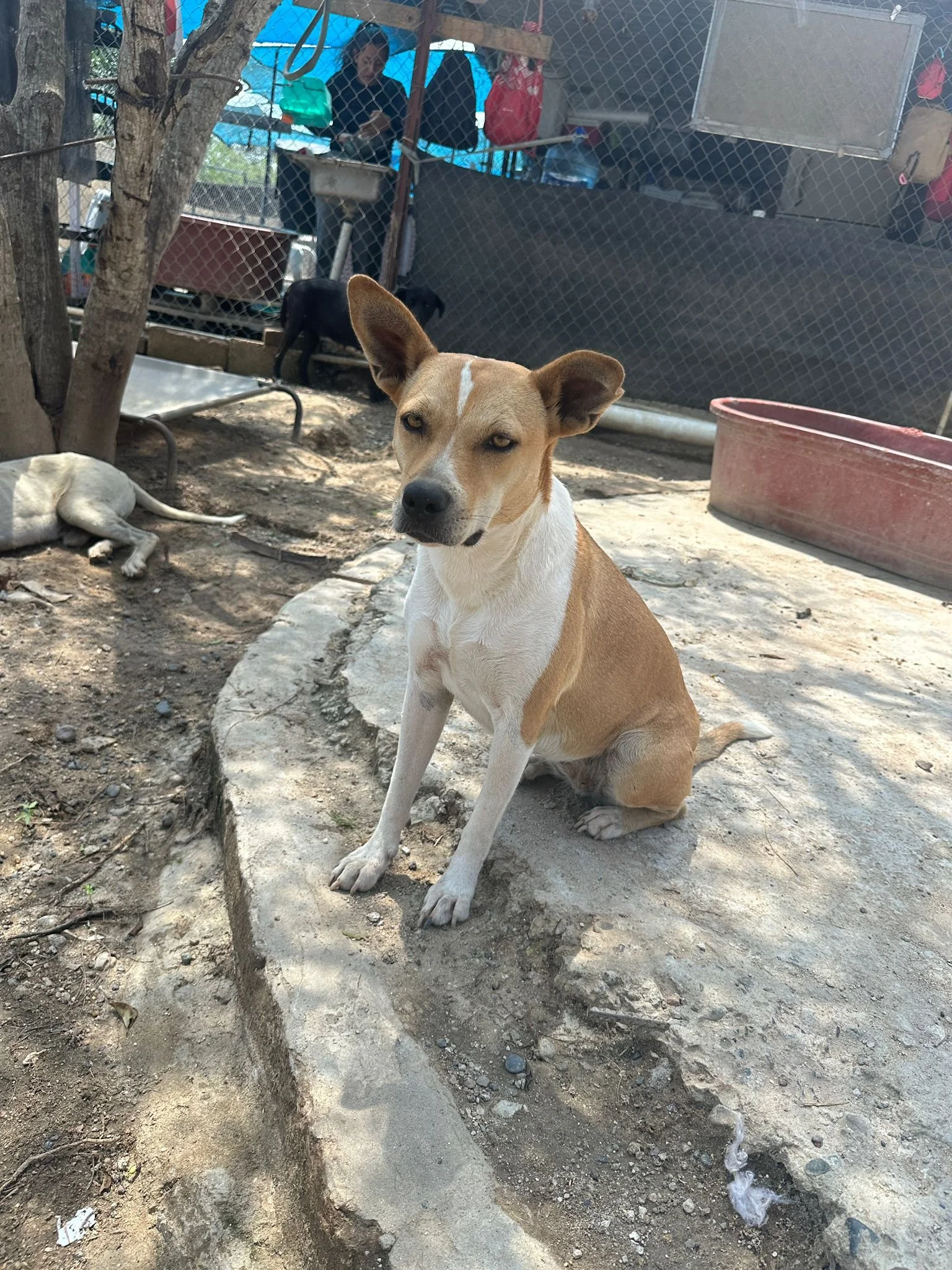 Mia, also known as Mamma Mia, was posted on Facebook as in need of rescuing. She was reported tied up outside, and her puppies had been placed in a box and thrown into the trash. Later, someone removed the pups from the trash, but they remained out of her reach. She was visibly stressed, unable to be with them, malnourished, and covered in ticks. Mia and her pups recovered with us. She is great with other dogs and quite playful. She appears to be a cattle dog/heeler mix, but we do not have information about her parents.